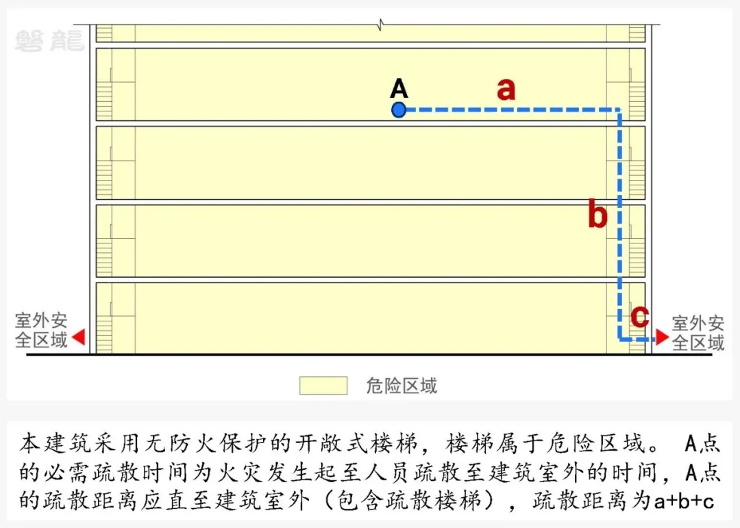 示例:在【圖示3】建筑中,采用無防火保護的開敞式樓梯,樓梯屬于危險區(qū)域,需要以建筑室外作為疏散時間的控制目標。必需疏散時間為火災發(fā)生起至人員疏散至建筑室外的時間,包括豎向疏散樓梯的疏散時間。室內(nèi)任意一點的疏散距離計算,均應延伸至建筑室外,本圖示中,A點的疏散距離為a+b+c。該建筑大部分區(qū)域的必需疏散時間均大于可用疏散時間,人員安全無法保證。