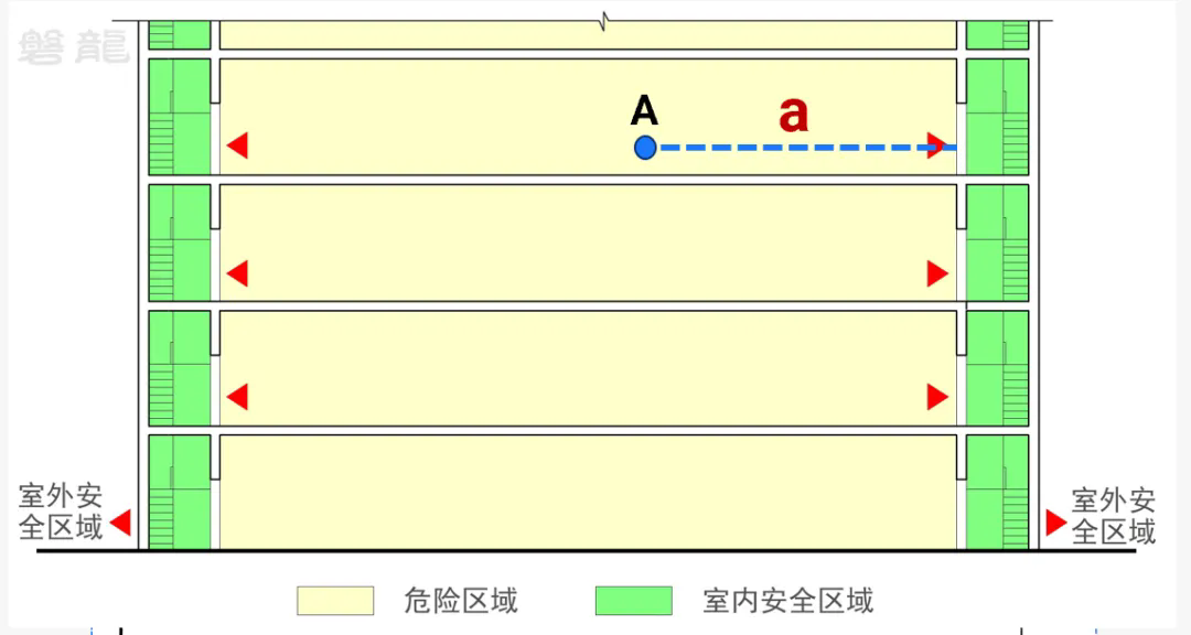 (2)以室內(nèi)安全區(qū)域作為必需疏散時間的控制目標。室內(nèi)任意點至建筑室外的疏散距離,優(yōu)化為至疏散樓梯間的疏散距離。以【圖示3】為例,將疏散樓梯間構建為室內(nèi)安全區(qū)域后,原A點處的疏散距離,由a+b+c轉化為a,參見【圖示7】。