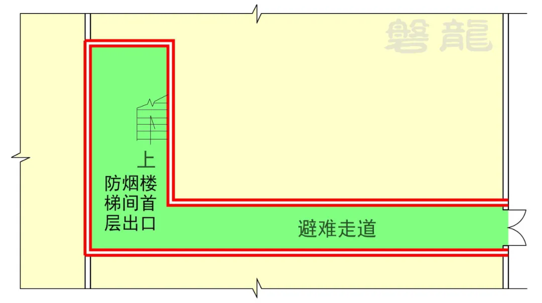 次危險區(qū)域是相對于危險區(qū)域的概念,是連接危險區(qū)域和安全區(qū)域的過渡空間。次危險區(qū)域主要包括疏散走道【圖示5】【圖示6】。