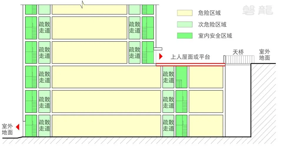 依據(jù)安全疏散路徑的確立原則,風險只能逐級遞減,當上人屋面或平臺需要通過疏散樓梯等室內(nèi)安全區(qū)域到達室外地面時,上人屋面和平臺只能作為室內(nèi)安全區(qū)域。