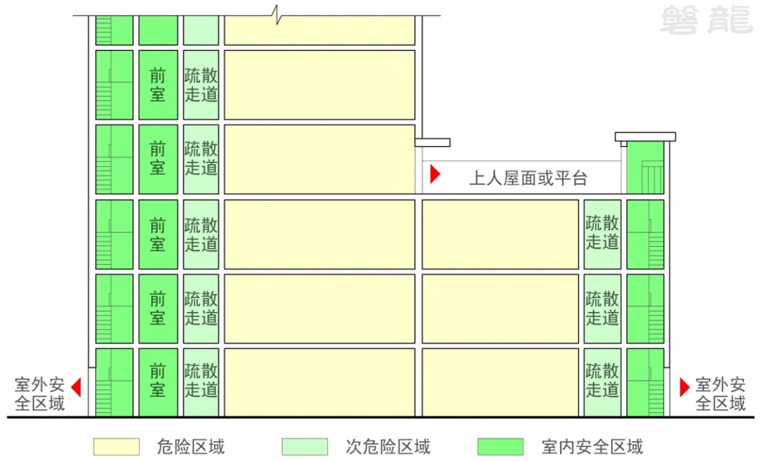 (1)設置室內(nèi)安全區(qū)域和次危險區(qū)域,作為疏散過程中的過渡與緩沖空間;