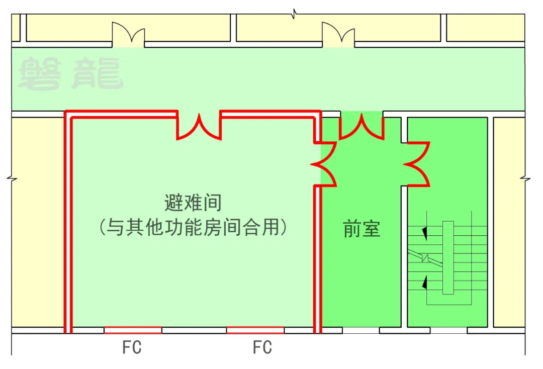 在【圖示17】中,避難間與前室以外的其他功能房間合用,不屬于室內(nèi)安全區(qū)域。