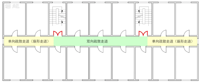 根據(jù)安全出口的數(shù)量及房間疏散門的相對(duì)位置,疏散走道的疏散形式可分為雙向疏散走道和單向疏散走道【圖示1】。