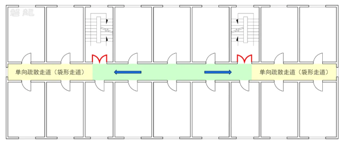 單向疏散走道是指僅能通過(guò)一個(gè)方向通往安全出口的走道,其盡端無(wú)出口,因形似“口袋”,又稱“袋形走道”【圖示3】。在現(xiàn)行標(biāo)準(zhǔn)中,“位于單向走道的房間疏散門”通常表述為“位于袋形走道的疏散門”。