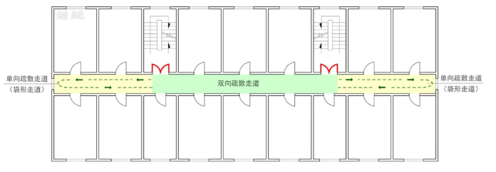 根據(jù)安全出口的數(shù)量及房間疏散門的相對(duì)位置,疏散走道的疏散形式可分為雙向疏散走道和單向疏散走道。