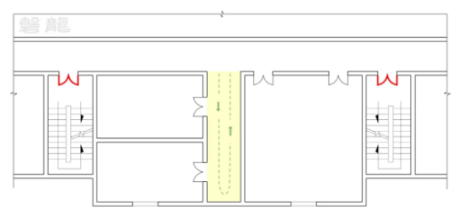 雙向疏散走道是指位于兩個(gè)安全出口之間的走道段。該區(qū)域內(nèi)的房間疏散門具備兩個(gè)疏散方向,可分別通向不同的安全出口【圖示2】,因此現(xiàn)行標(biāo)準(zhǔn)允許的疏散距離較長(zhǎng)。在現(xiàn)行標(biāo)準(zhǔn)中,“位于雙向疏散走道的房間疏散門”通常表述為“位于兩個(gè)安全出口之間的房間疏散門”。