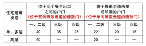 (2)表5.5.17和表5.5.29所述的 “位于袋形走道兩側(cè)或盡端的疏散門(戶門)”,統(tǒng)一對(duì)應(yīng)為“位于單向疏散走道的疏散門(戶門)”。