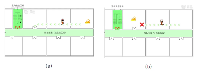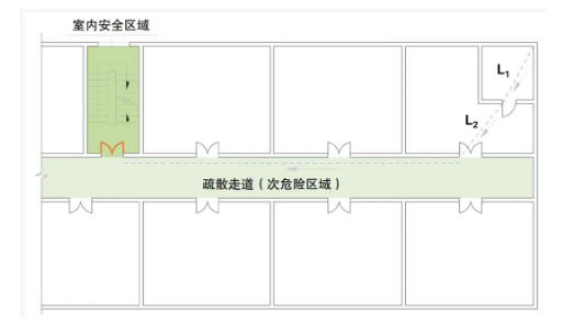 室內(nèi)房間屬于危險區(qū)域,一旦發(fā)生火災(zāi),人員應(yīng)迅速疏散至相對安全的次危險區(qū)域(疏散走道),通過疏散走道疏散至安全出口【圖示1】。