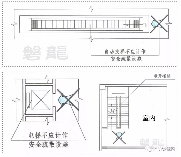 一、敞開樓梯間,是指一面敞開,三面為實(shí)體圍護(hù)結(jié)構(gòu)的疏散樓梯間: 在如圖所示的建筑中,雖然有敞開樓梯間連通,但不同的樓層還是可以劃分為獨(dú)立的防火分區(qū)。 五、敞開樓梯間應(yīng)符合下列規(guī)定: 1、樓梯間應(yīng)能天然采光和自然通風(fēng),并宜靠外墻設(shè)置??客鈮υO(shè)置時(shí),樓梯間窗口與兩側(cè)門、窗、洞口最近邊緣的水平距離不應(yīng)小于1.0m。 2、樓梯間內(nèi)不應(yīng)設(shè)置燒水間、可燃材料儲(chǔ)藏室、垃圾道。 3、樓梯間內(nèi)不應(yīng)有影響疏散的凸出物或其他障礙物。 4、樓梯間內(nèi)不應(yīng)設(shè)置甲、乙、丙類液體管道。 5、敞開樓梯間內(nèi)不應(yīng)設(shè)置可燃?xì)怏w管道。注:當(dāng)住宅建筑的敞開樓梯間內(nèi)確需設(shè)置可燃?xì)怏w管道和可燃?xì)怏w計(jì)量表時(shí),應(yīng)采用金屬管和設(shè)置切斷氣源的閥門。 一、敞開樓梯直接對(duì)室內(nèi)開放,不能形成圍合的疏散空間,不能作為疏散樓梯使用。 二、敞開樓梯、自動(dòng)扶梯、電梯等,均不能作為疏散設(shè)施。 1、建筑內(nèi)的自動(dòng)扶梯處于敞開空間,火災(zāi)時(shí)容易受到煙氣的侵襲,且梯段坡度和踏步高度與疏散樓梯的要求有較大差異,難以滿足人員安全疏散的需要,故設(shè)計(jì)不能考慮其疏散能力。 2、對(duì)于普通電梯,火災(zāi)時(shí)動(dòng)力將被切斷,若火災(zāi)時(shí)作為人員的安全疏散設(shè)施是不安全的,火災(zāi)時(shí)人員疏散只能使用樓梯,電梯不能用作疏散設(shè)施。 3、消防電梯在火災(zāi)時(shí)如供人員疏散使用,需要配套多種管理措施,目前只能由專業(yè)消防救援人員控制使用,且一旦進(jìn)入應(yīng)急控制程序,電梯的樓層呼喚按鈕將不起作用,因此消防電梯也不能計(jì)入建筑的安全出口。 三、建筑內(nèi)設(shè)置的敞開樓梯、自動(dòng)扶梯等,其上、下層相連通的開口,防火分區(qū)的建筑面積應(yīng)按上、下層相連通的建筑面積疊加計(jì)算(或應(yīng)采用防火卷簾等防火分隔措施)。