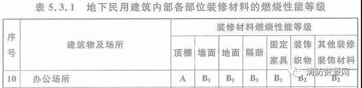 3、地下辦公建筑內(nèi)部各部位裝修材料的燃燒性能等級,不應低于下表規(guī)定。(5.3.1)