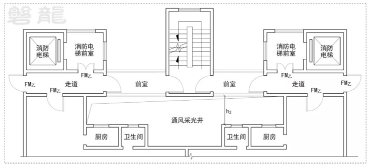 圖1所示的方案,連廊僅作為疏散走道,屬于次危險區(qū)域,規(guī)范對于疏散走道并無明確要求,但亦應(yīng)考慮一定的安全間距,h1≥2m應(yīng)可滿足要求。 二、當(dāng)連廊作為前室或前室連通區(qū)域時,應(yīng)視為相對安全區(qū)域,須考慮合理的安全間距。 圖2的連廊作為前室,圖3的連廊作為前室通往樓梯間的一部分,這兩種圖示的連廊,風(fēng)險等級和前室相當(dāng),應(yīng)視為相對安全區(qū)域,須考慮合理的安全間距,可參照規(guī)范圖示“回字形”建筑平面示例,h2≥6m(有爭議)。