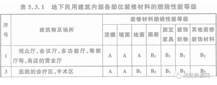 三、地下建筑中的醫(yī)院診療區(qū)、手術(shù)區(qū),內(nèi)部各部位裝修材料的燃燒性能等級,不應(yīng)低于《建筑內(nèi)部裝修設(shè)計(jì)防火規(guī)范》表5.3.1的規(guī)定。