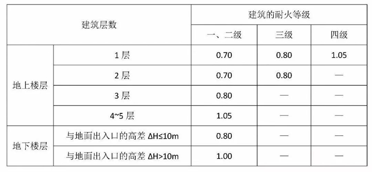 示例,建筑高度為四層的一級耐火等級建筑,按《中小學校設(shè)計規(guī)范》8.2.3要求,每100人所需的最小疏散凈寬度,地上一、二層的為0.7m、地上三層為0.8m、地上四層為1.05m;按《建筑設(shè)計防火規(guī)范》5.5.21要求,以總層數(shù)為單位,一至四層均為1.0m;