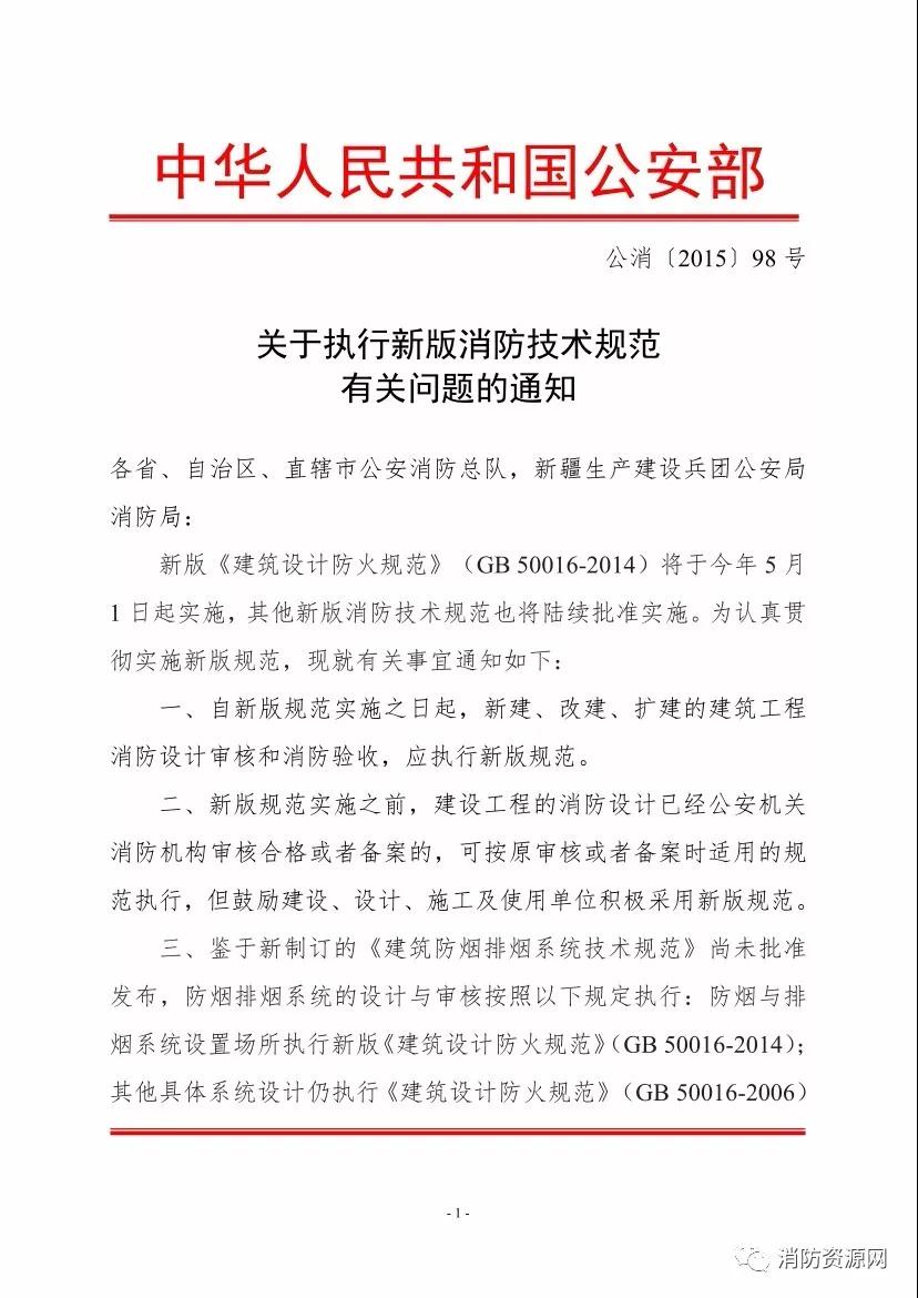 石崢嶸:新版消防技術(shù)規(guī)范,應(yīng)參照“公消[2015]98號(hào)”文件的相關(guān)精神執(zhí)行! “公消[2015]98號(hào)”文件發(fā)布于2015年4月27日,明確了《建筑設(shè)計(jì)防火規(guī)范》(GB 50016-2014)以及后續(xù)發(fā)布的其他新版消防技術(shù)規(guī)范的執(zhí)行要求,原文摘錄如下: ..